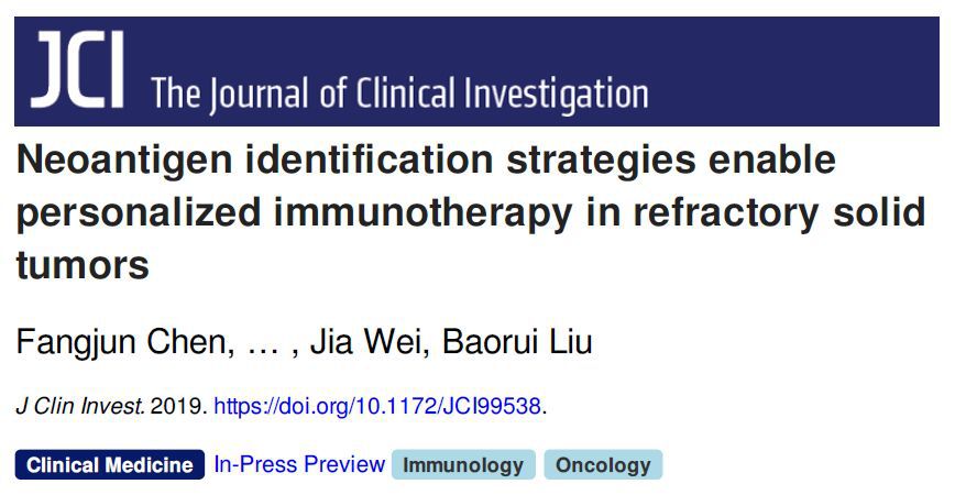 基于以上研究背景的思考,刘宝瑞教授团队的陈仿军博士作为第一作者在国际知名期刊《Journal of Clinical Investigation》(JCI)上发表了一项免疫治疗新技术研究成果,这是我国肿瘤新抗原个体化免疫治疗领域罕有的原创性论著。